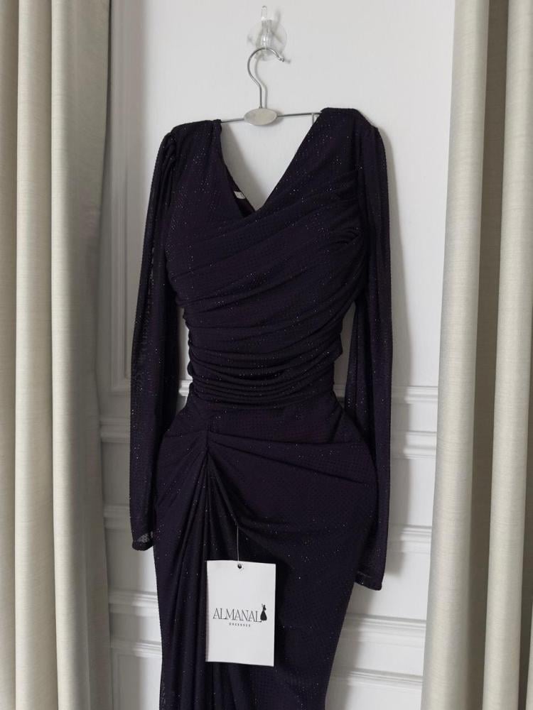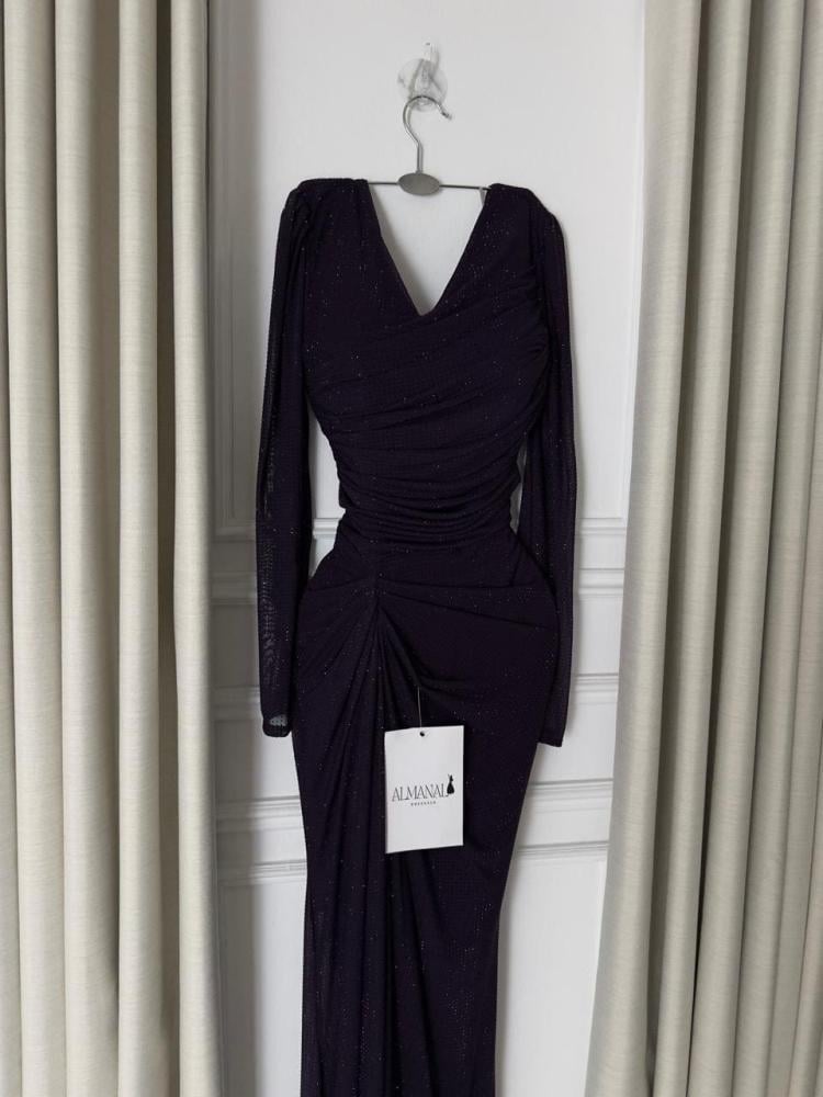 مميزات فستان ناعم باذنجاني استرتش لمعة بأكمام