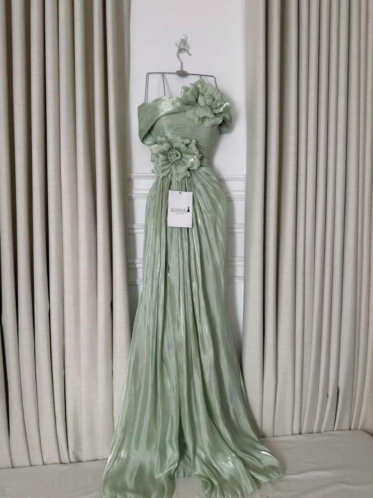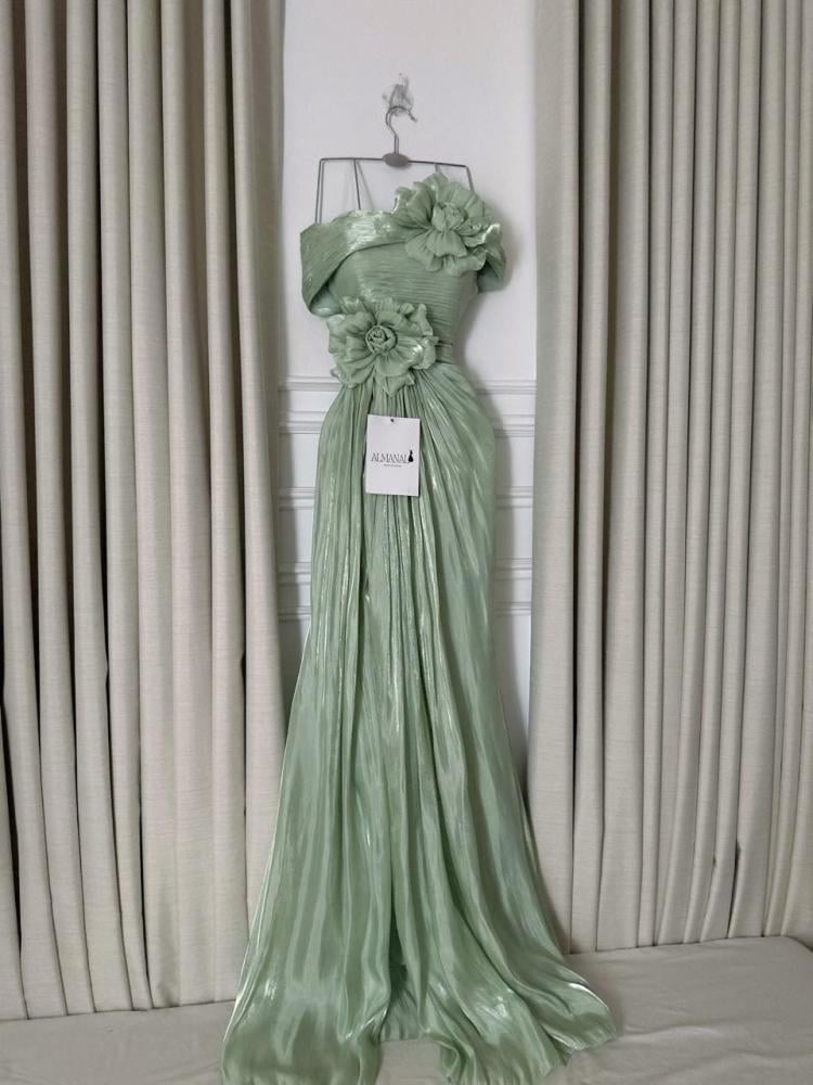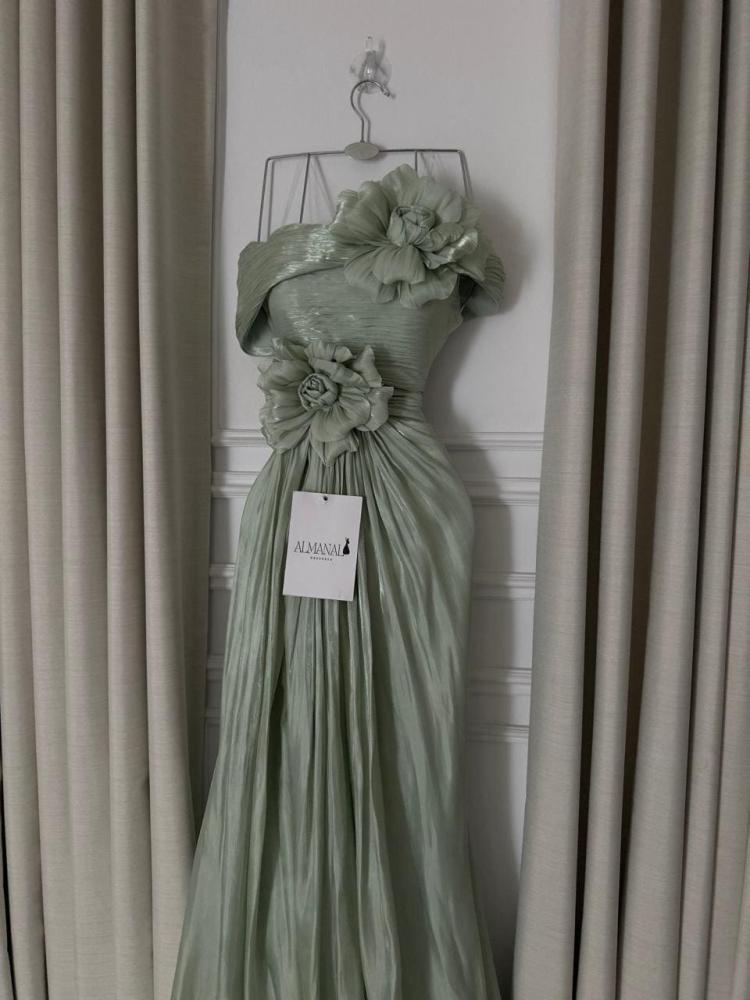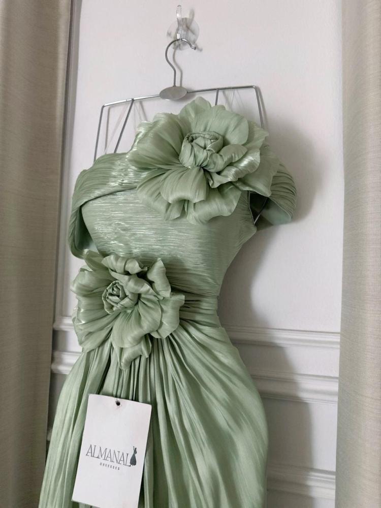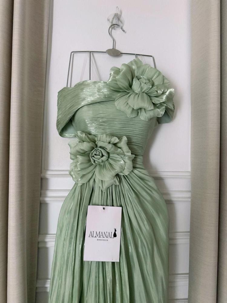مميزات فستان ناعم أوف شولدر بوردات لون أخضر باستيل