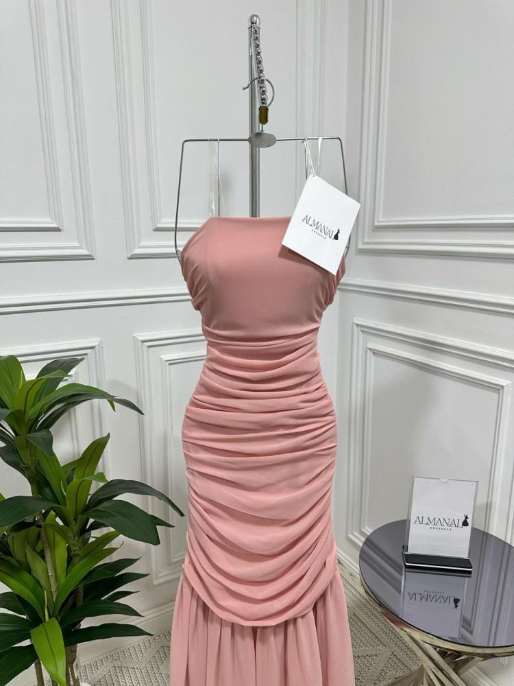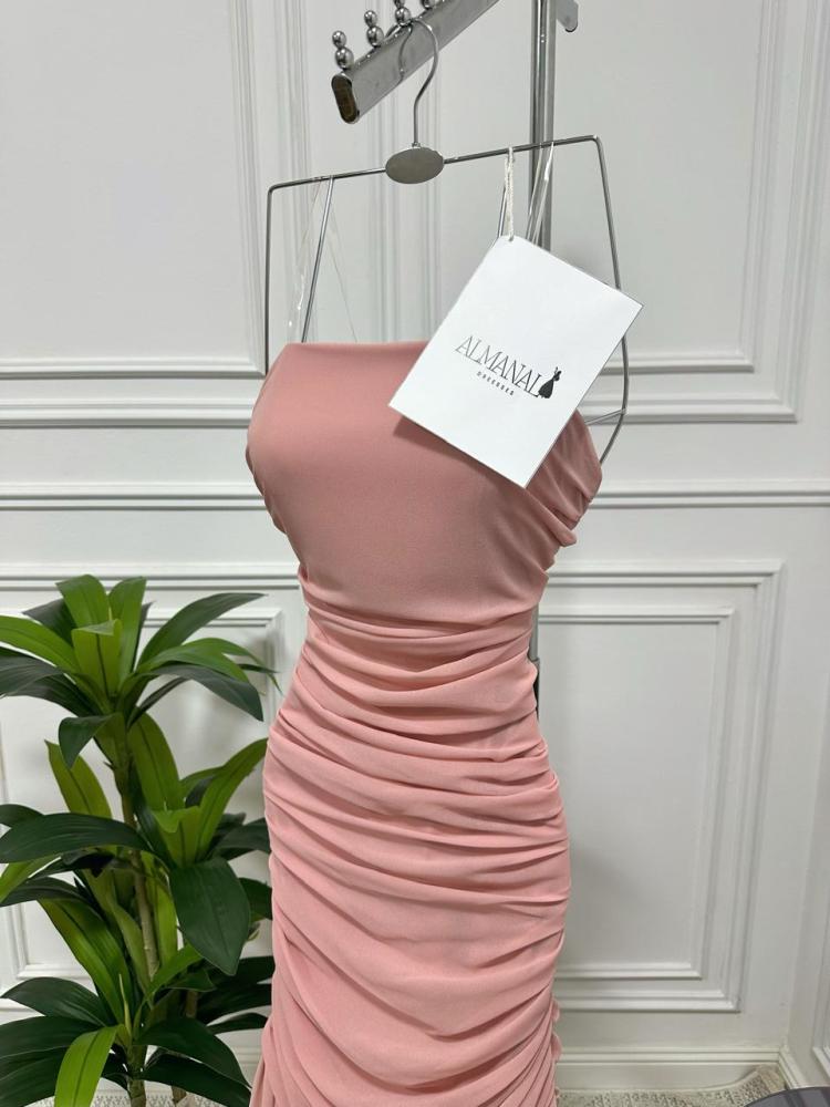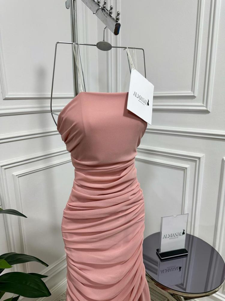 مميزات: فستان سهره وردي بقصة ضيقة وطيات أنثوية ناعمة