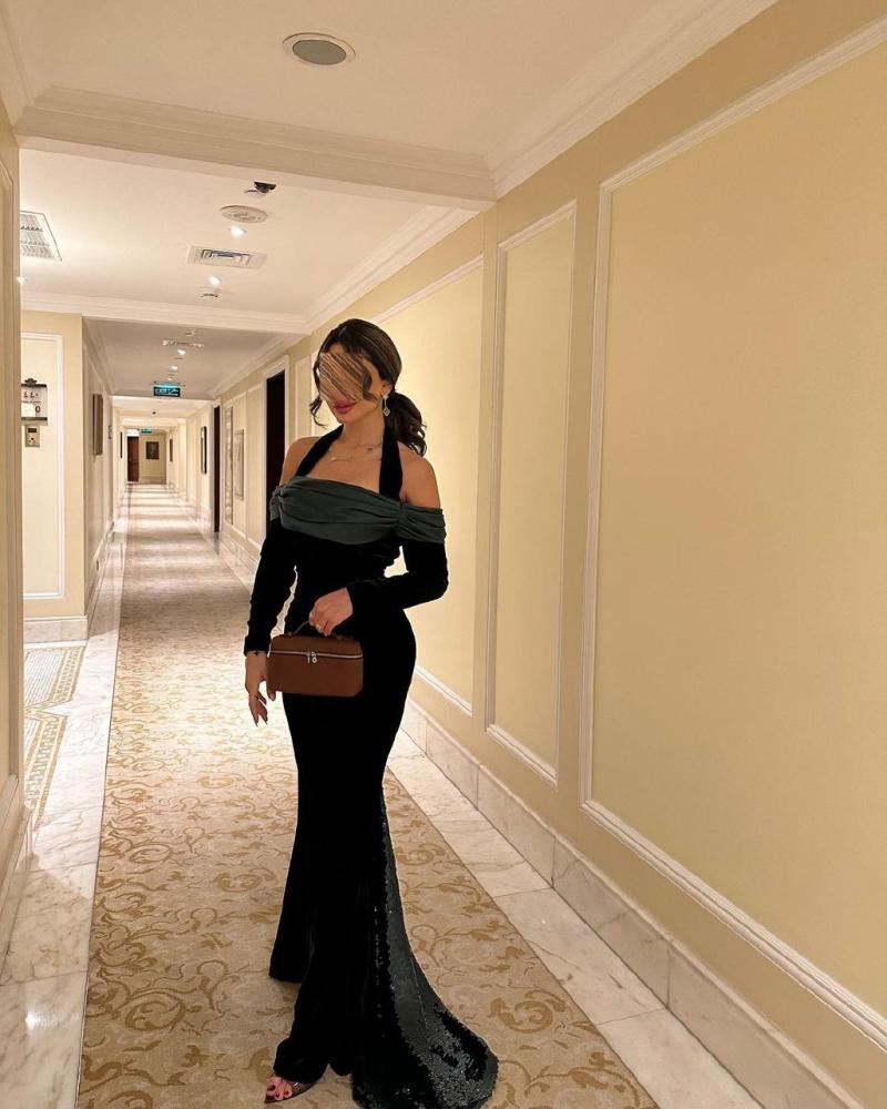 - التصميم: فستان فاخر يجمع بين التفته والاسترتش مع ترتر متلألئ لإطلالة أنثوية راقية