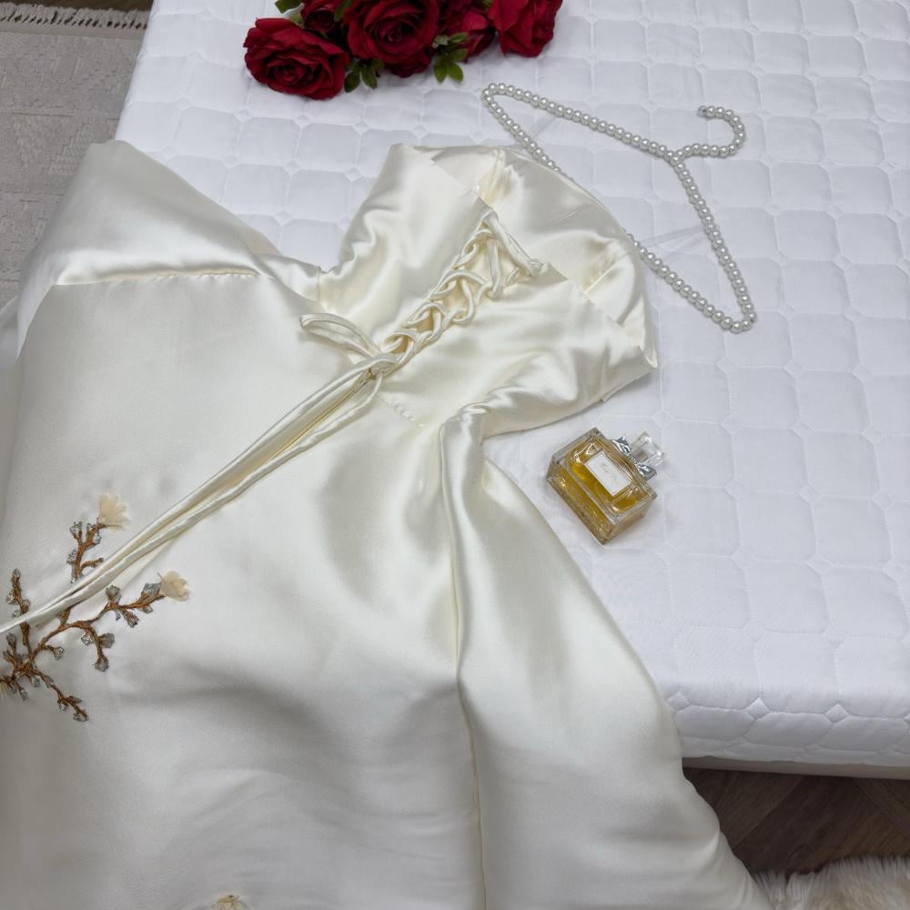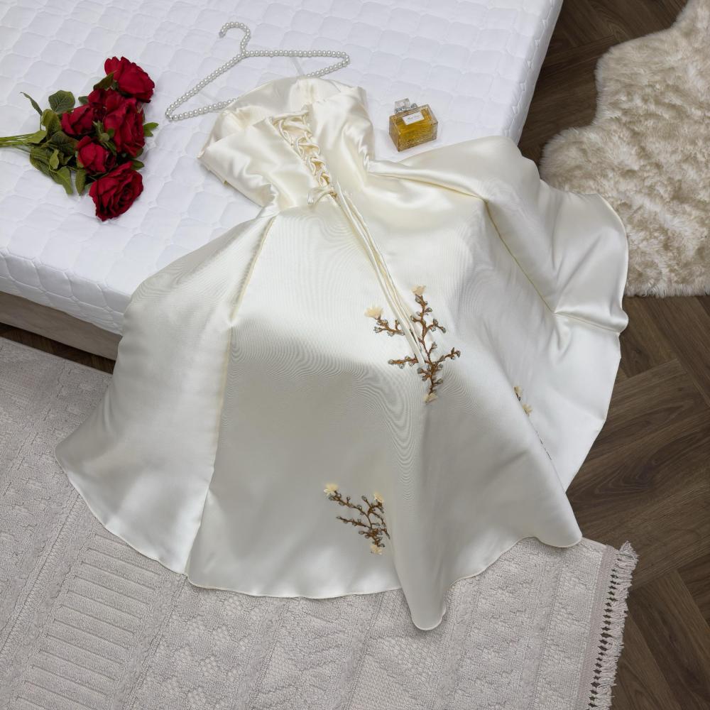 - خامة ميكادو فاخرة وناعمة تمنح الفستان ملمسًا راقيًا وفخمًا.