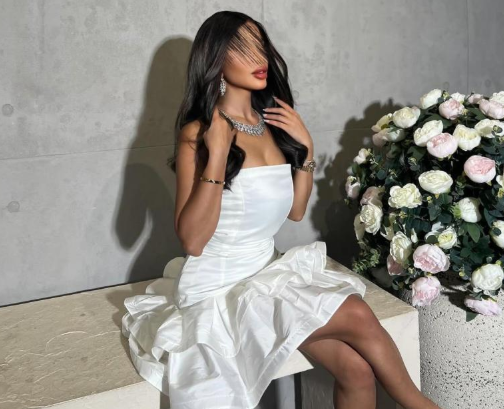 - فستان قصير ناعم ميكادو: فستان فاخر بخامة ميكادو لإطلالة ساحرة في السهرات.