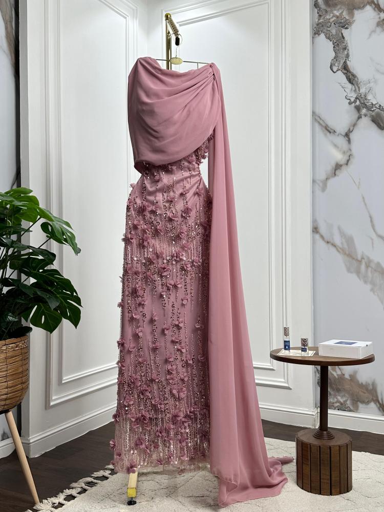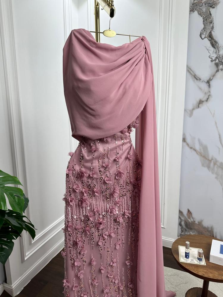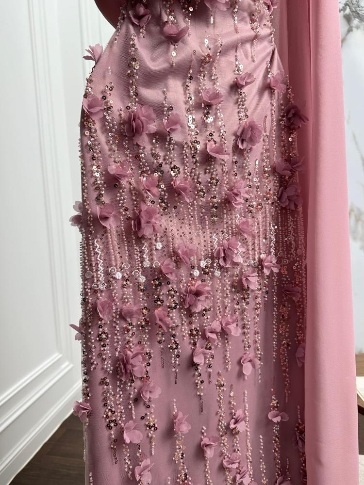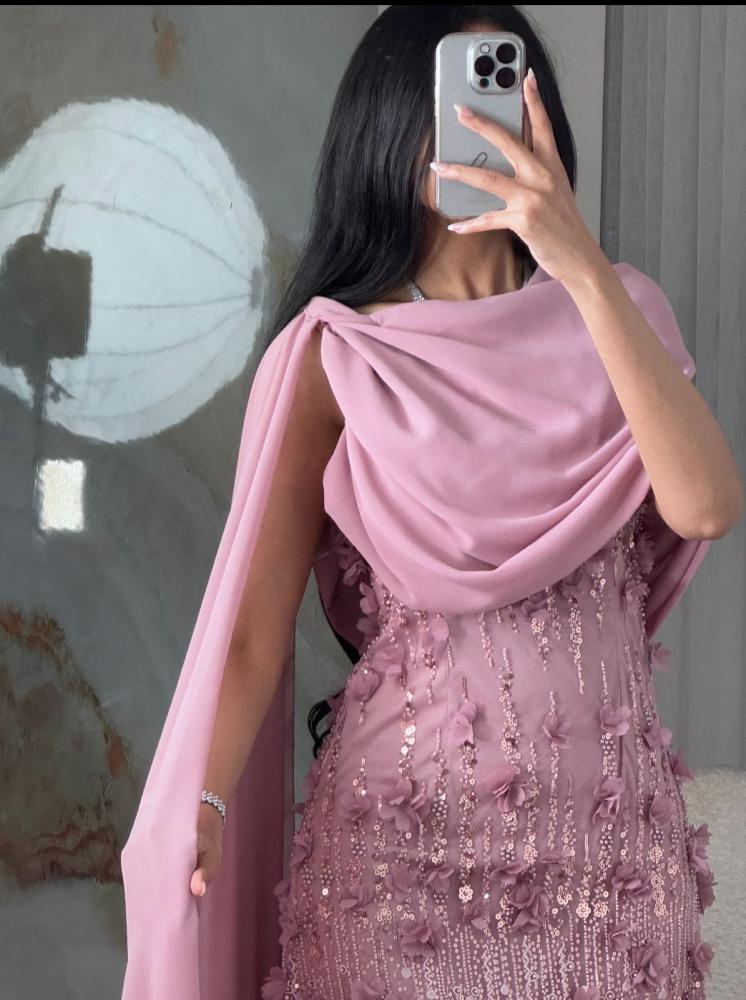 - التصميم: فستان شك مورد مزين بشال جورجيت ناعم وانسيابي