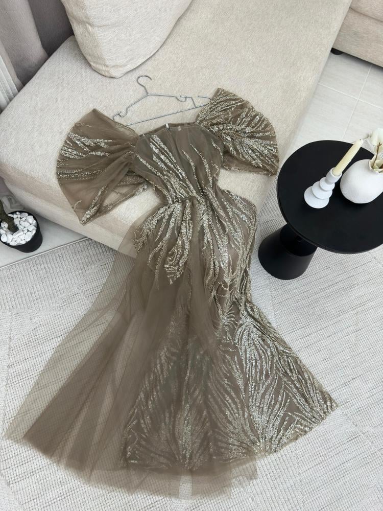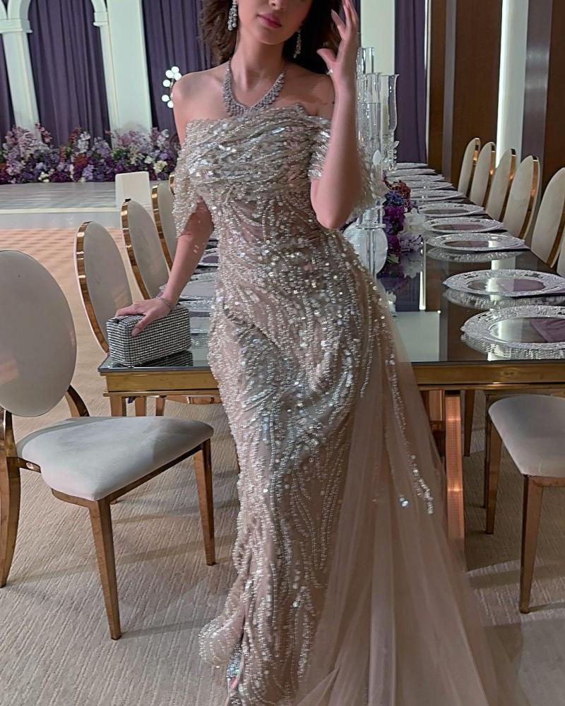 - التصميم: فستان مطرز بالخرز لإطلالة أنثوية متألقة