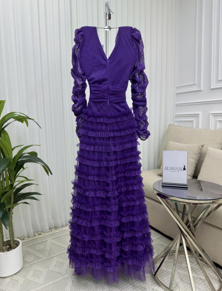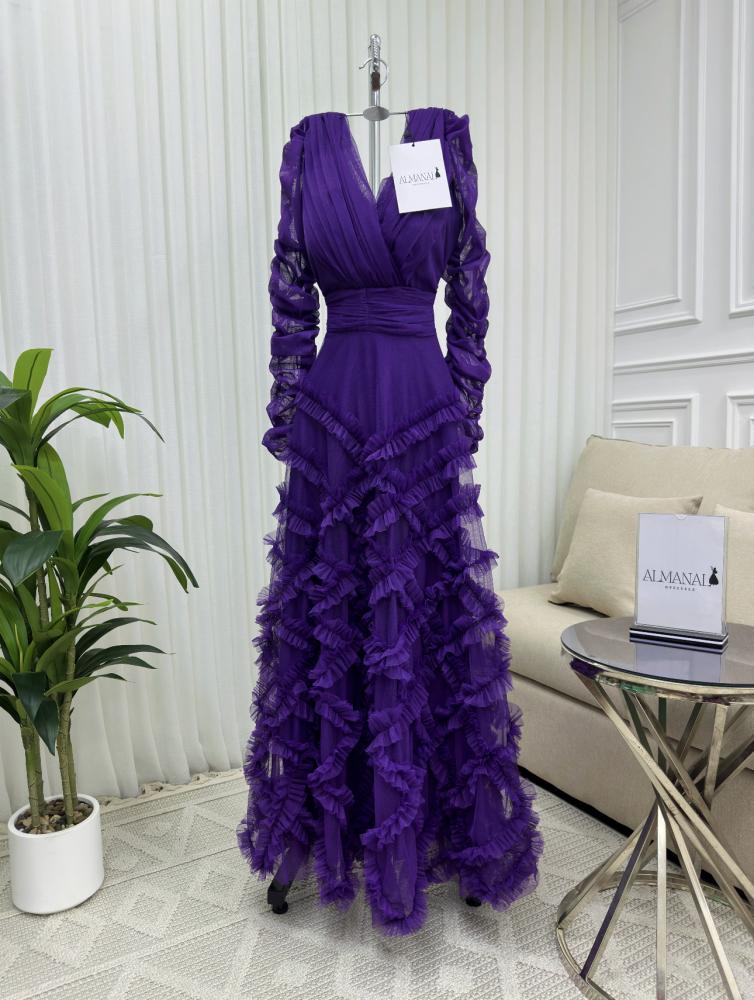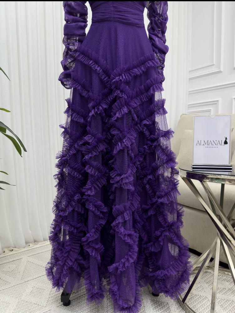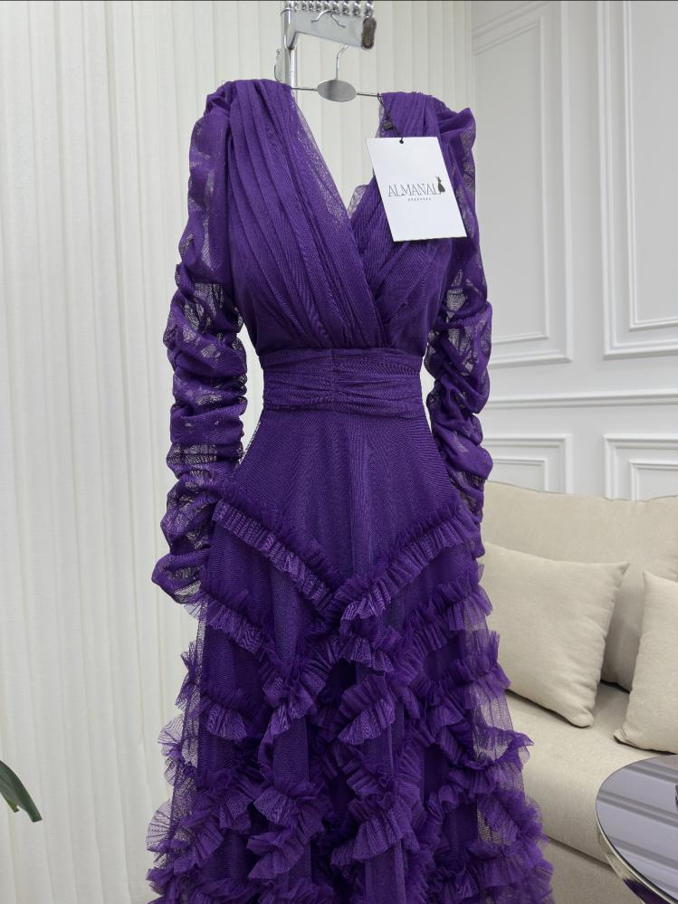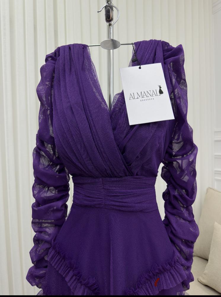 مميزات – فستان شيفون بكسرات وأكمام طويلة لون بنفسجي تل