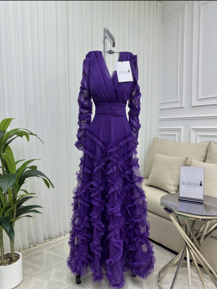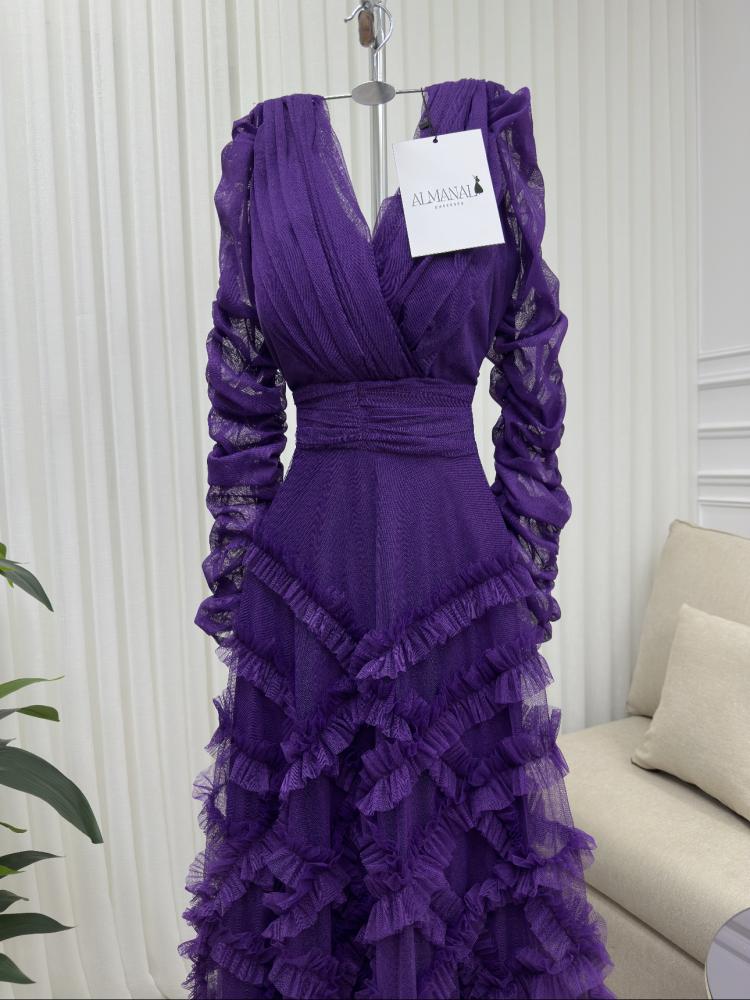 تألقي بأناقة حالمة مع فستان شيفون بكسرات وأكمام طويلة لون بنفسجي تل من المنال، حيث يجمع التصميم بين نعومة الشيفون وخفة التل مع تفاصيل الكسرات التي تضفي حركة وانسيابية مميزة. الأكمام الطويلة تمنح الفستان لمسة كلاسيكية راقية، ولون البنفسجي يعزز أنوثتك ويجعلك محط الأنظار في كل مناسبة.