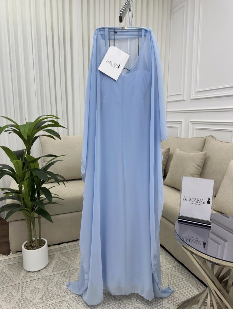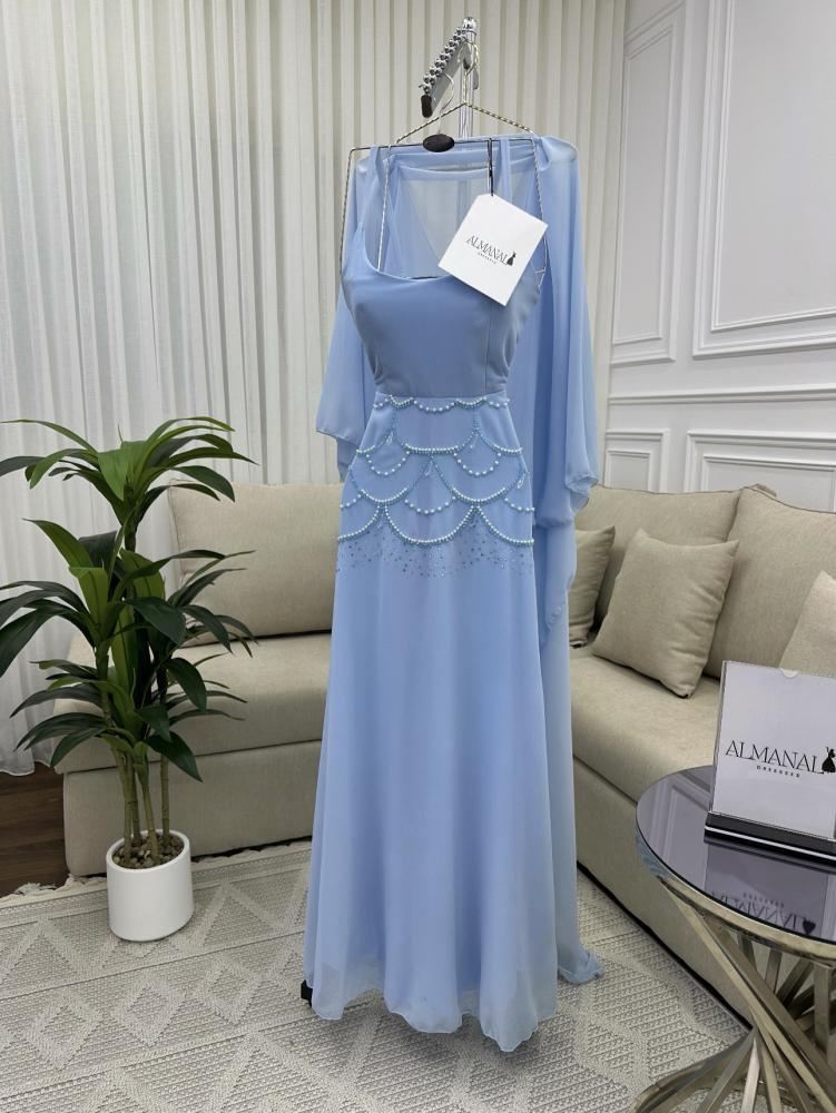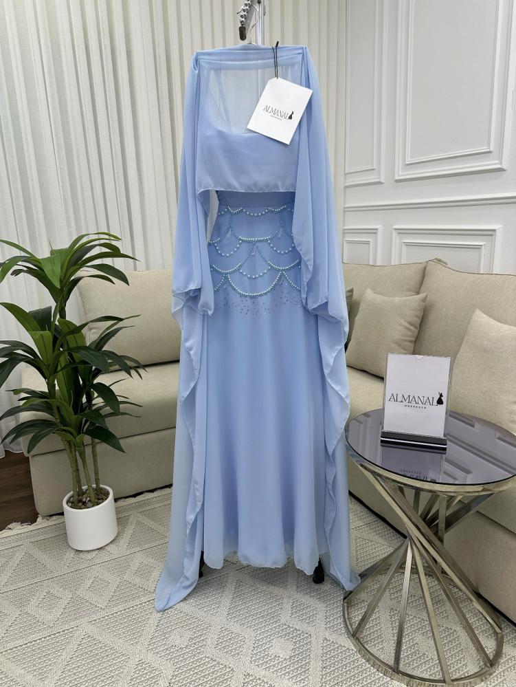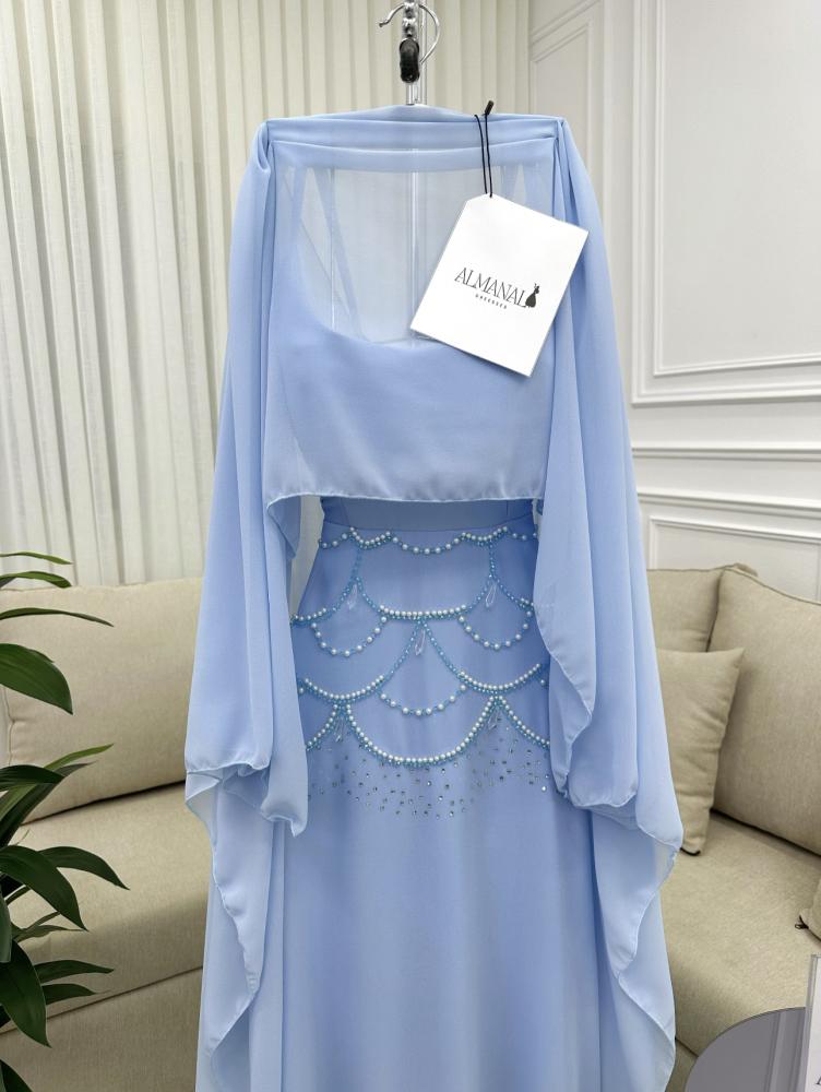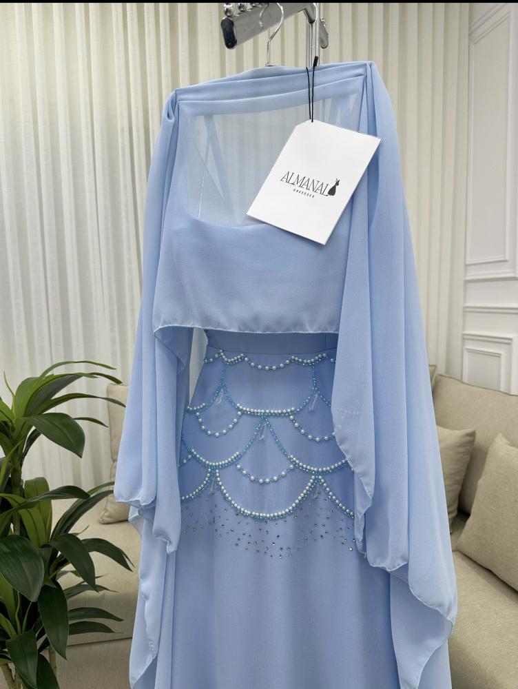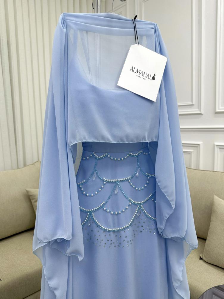 مميزات – فستان شيفون سماوي بتفاصيل لؤلؤ وأكمام منسدلة