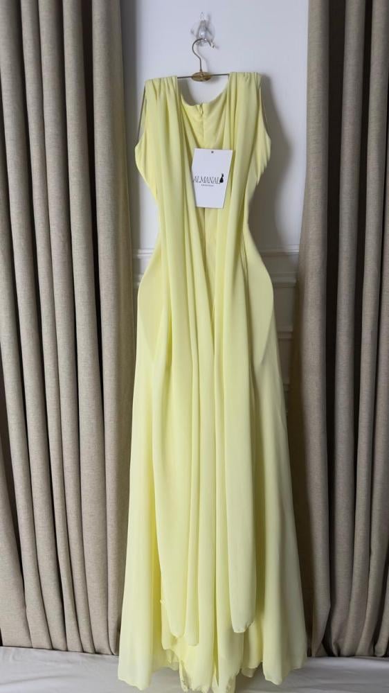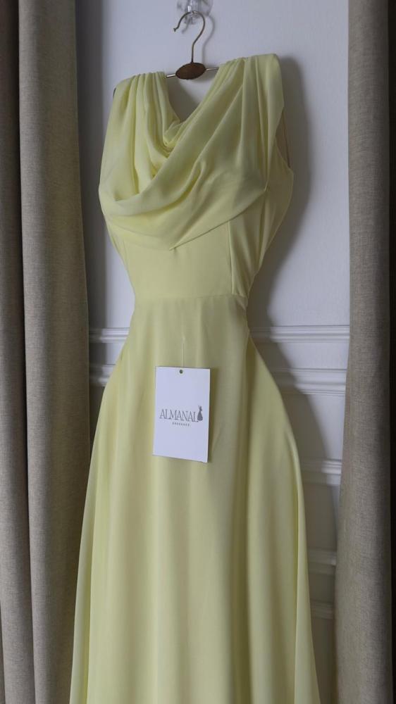 - التصميم: فستان بخامة شيفون ناعمة مع لون ليموني حيوي
