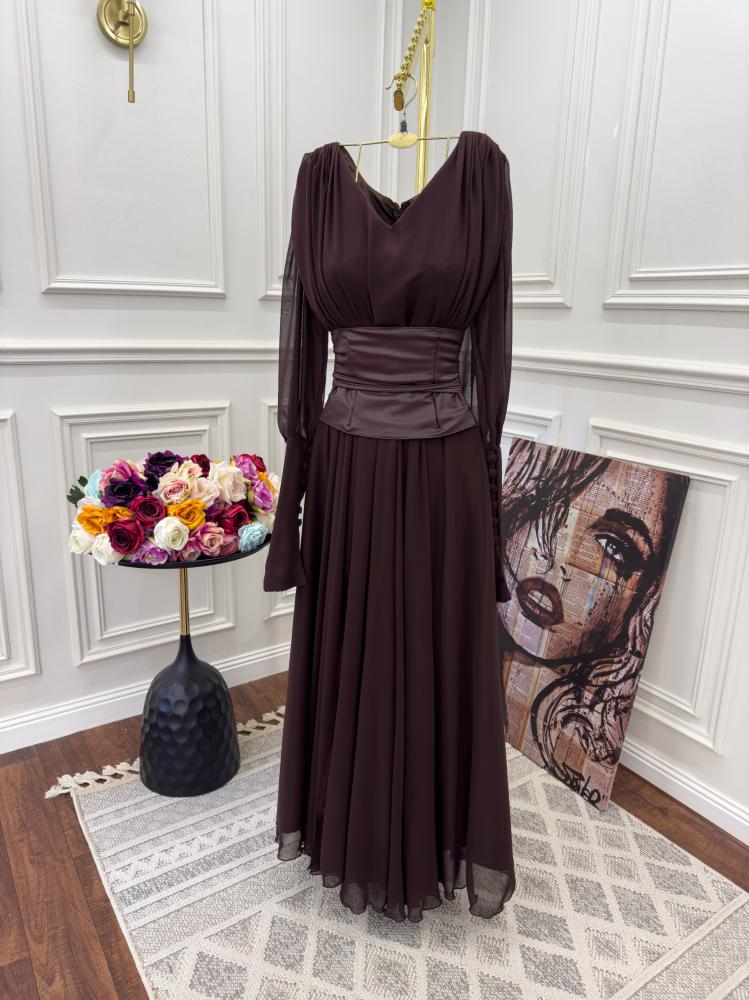 تميزي بإطلالة راقية مع فستان ناعم بني شيفون، الذي يجمع بين الخفة والأناقة بخامة الشيفون الفاخرة وتصميم أنثوي جذاب يمنحك مظهراً مميزًا. مثالي للسهرات والمناسبات الخاصة، ليبرز جمال القوام ويضفي لمسة فخامة وراحة طوال الوقت.