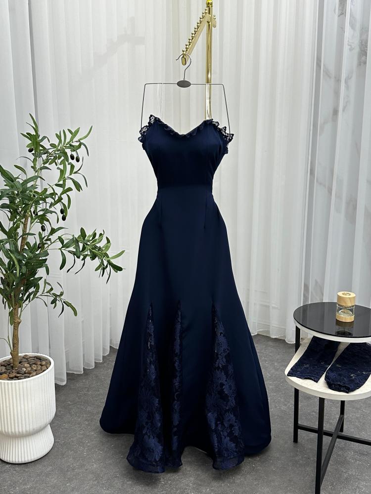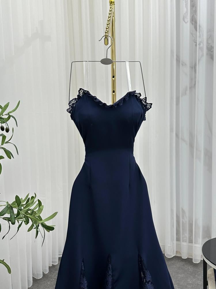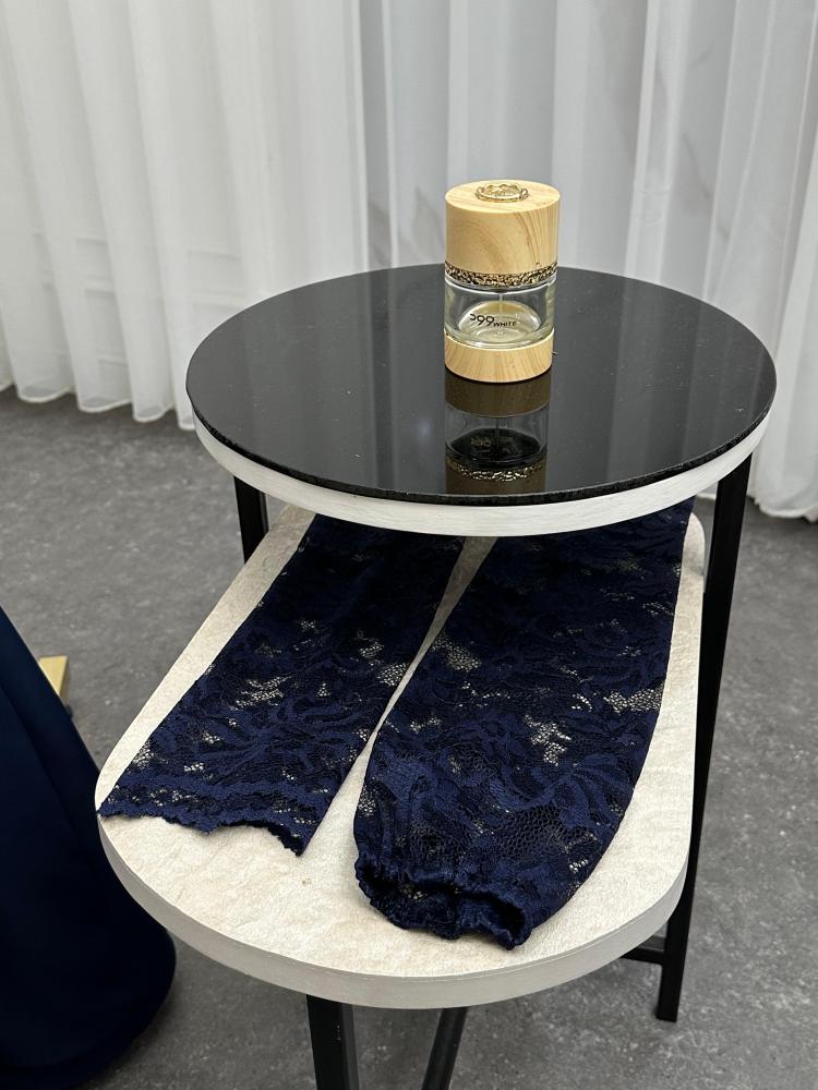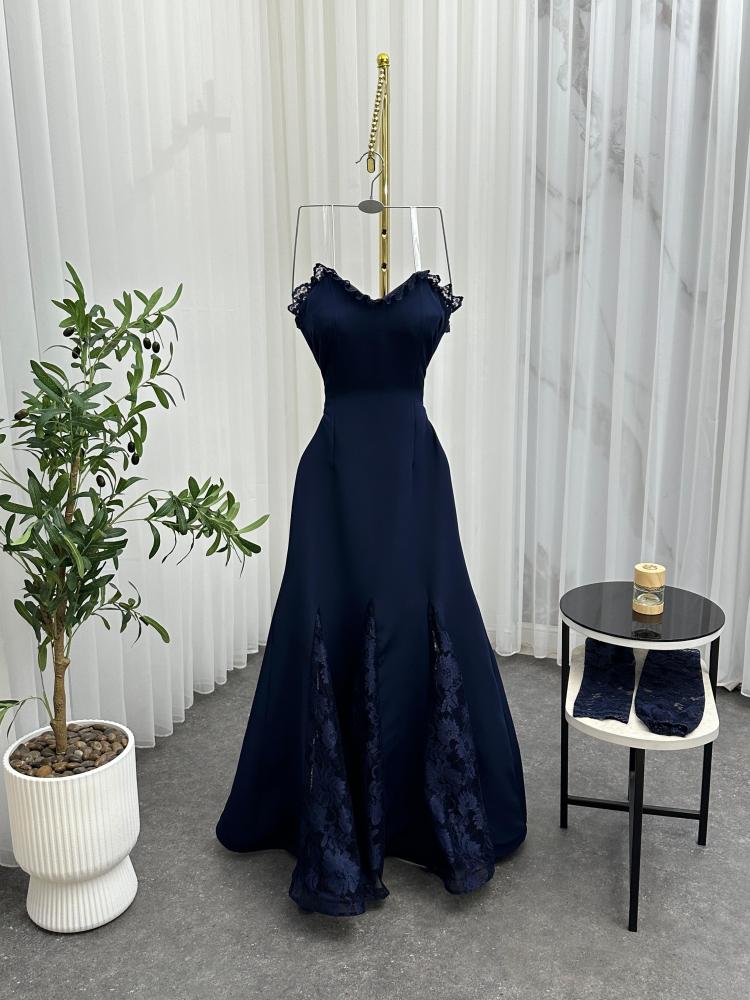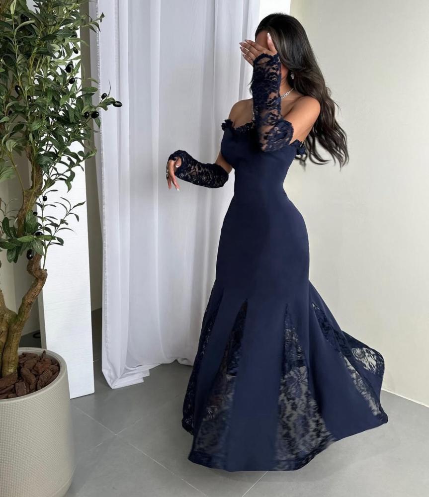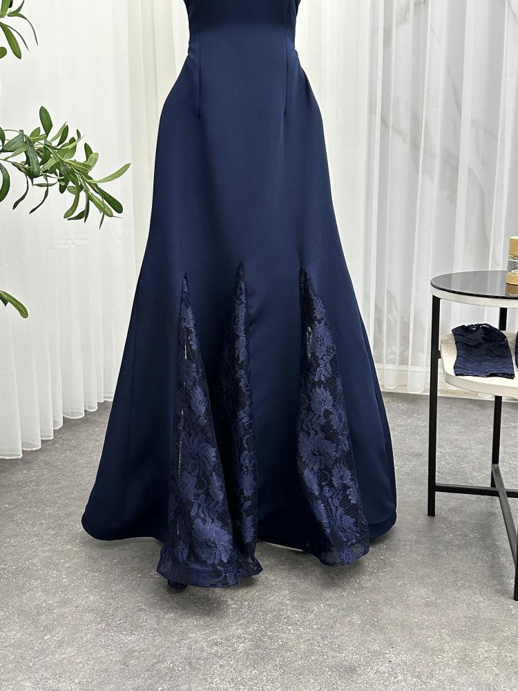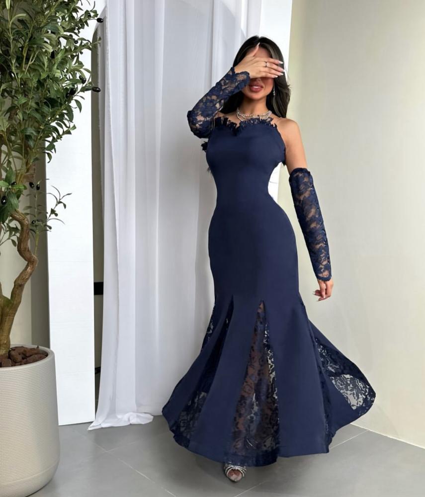 - خامة دانتيل كحلي ناعمة مع طبقة باربي فاخرة تمنح الفستان ملمسًا ناعمًا ومظهرًا فاخرًا.
