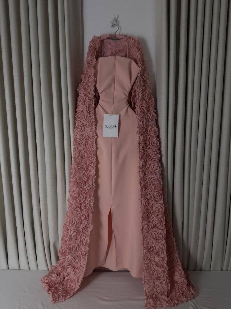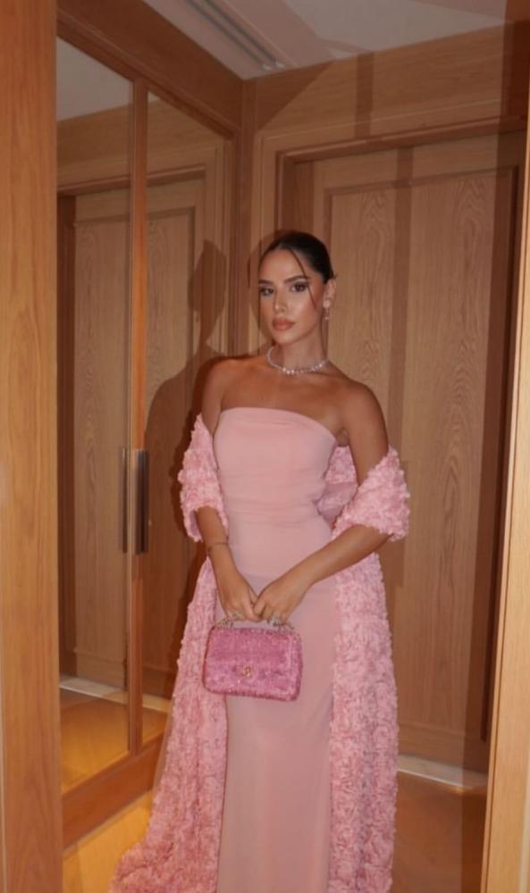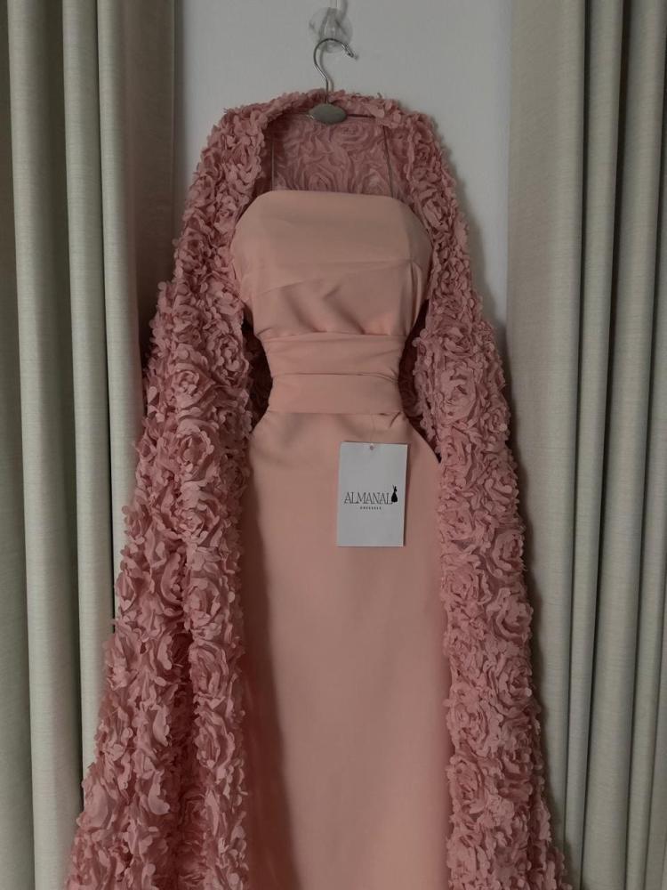 ج: نعم، فستان سهرة وردي لحمي كلفة ورود مثالي للسهرات والمناسبات الخاصة.