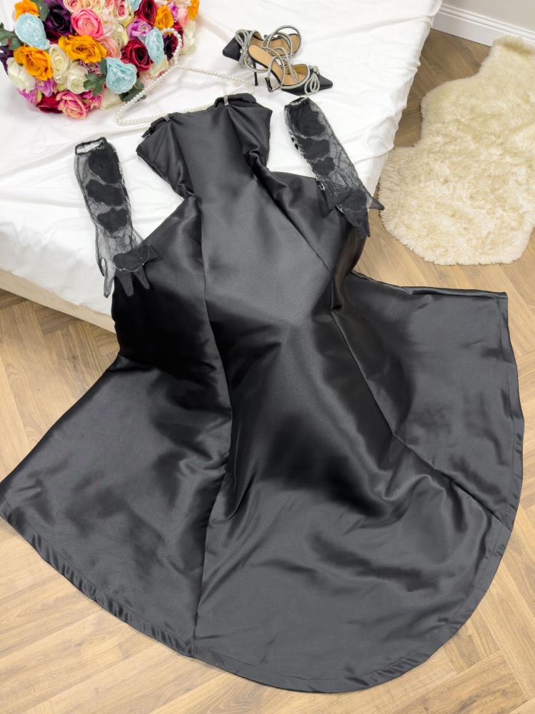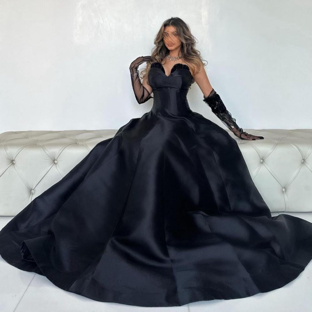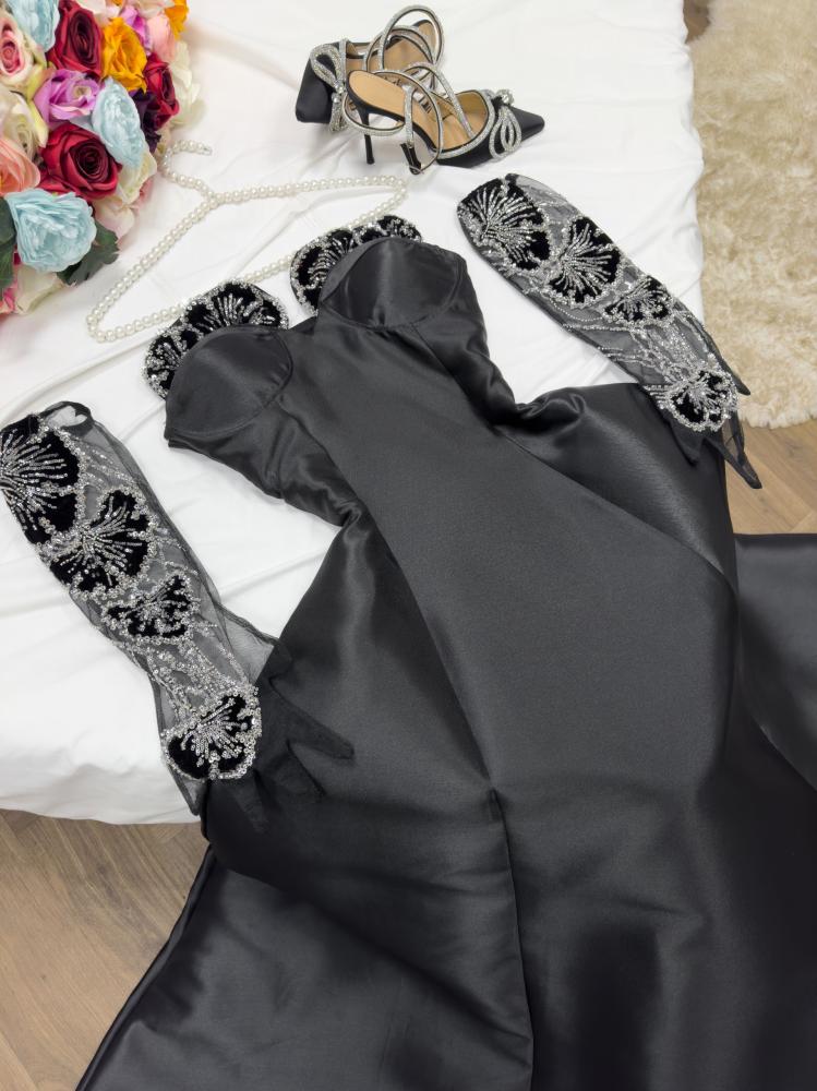 المميزات: فستان سهرة أسود ميكادو بفتحة صدر قلب وقفازات تطريز لؤلؤية