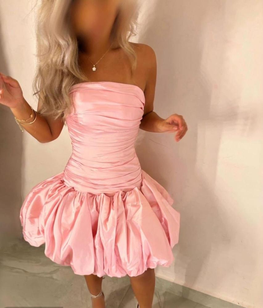 أبرزي أنوثتك بأناقة مع فستان ناعم قصير وردي الذي يمنحك إطلالة رقيقة وجذابة تخطف الأنظار في أي مناسبة. تصميمه القصير وخامته الناعمة تجعل منه الخيار المثالي للسهرات والحفلات النهارية.